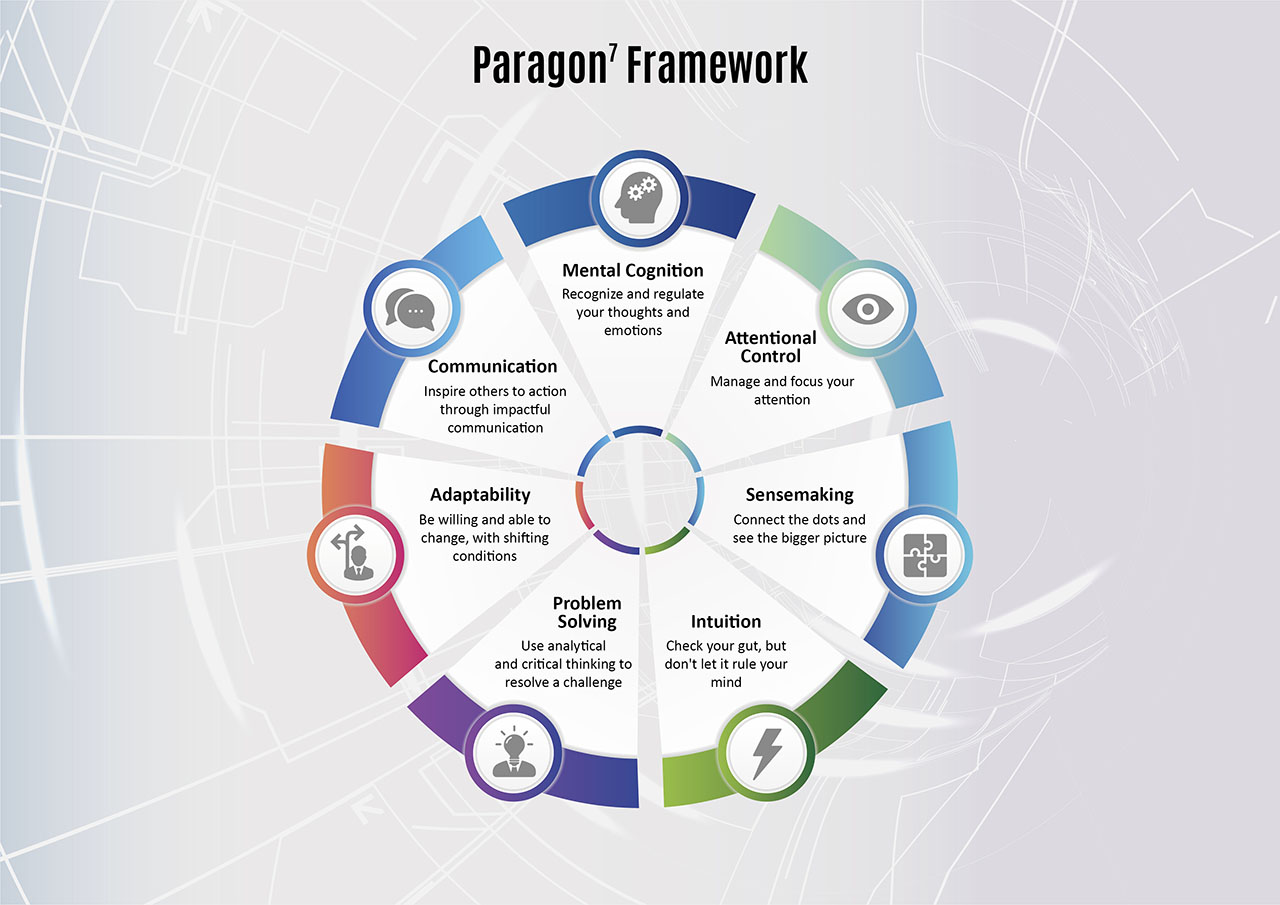 This immersive program applies the Paragon⁷™ Framework of Cognitive Readiness (see Figure 1)—metacognition, attentional control, sensemaking, intuition, problem solving, adaptability, communication—tailored for real-world hybrid human + AI workflows.