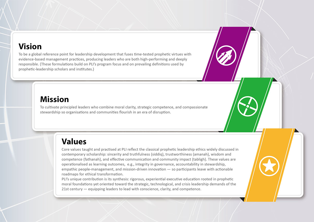 Management as a discipline has evolved for more than a century, shaped by diverse organisational theories and leadership philosophies. The Prophetic Leadership Masterclass Program builds on this rich heritage while grounding its core principles in the teachings of Islam and the Seerah, the life and leadership legacy of Prophet Muhammad ﷺ, as well as the exemplary guidance of the righteous Caliphs. Each module is carefully designed to translate these timeless prophetic principles into relevant and actionable leadership practices for today’s organisational landscape.