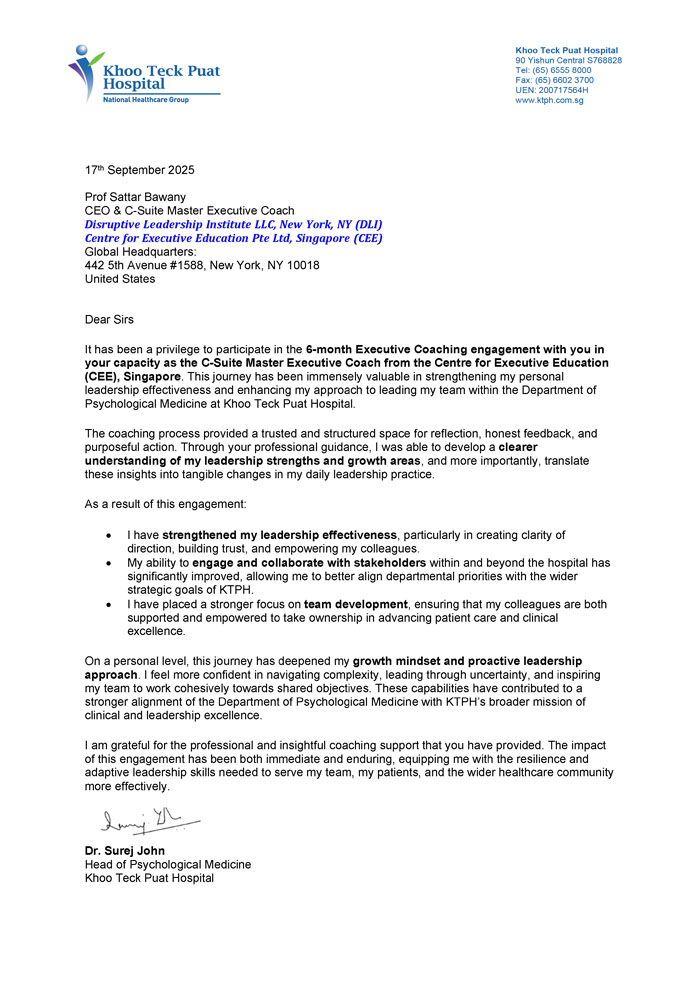 Many testimonials highlight our panel of coaches’ ability to rapidly build trust and rapport with their coachees, creating a safe and reflective environment for personal growth. Executives from multinational corporations, government agencies, and non-profit organizations have described his coaching as “life-changing,” noting that it not only enhanced their leadership capabilities but also strengthened their emotional intelligence and decision-making skills. A common sentiment shared by clients is that our coaches possess a rare ability to ask the right questions—those that provoke deep introspection and inspire meaningful change.